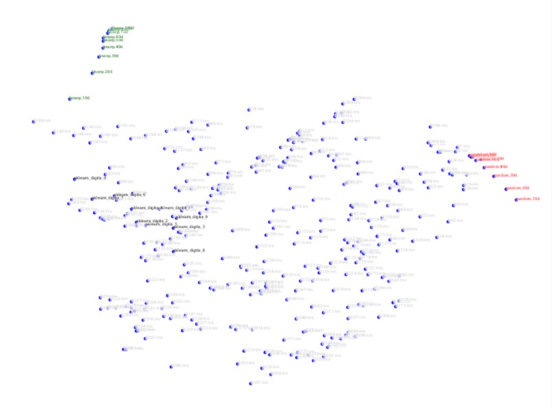A map of classification tasks in two complexity dimensions: easy, linearly separable problems (green), randomly labeled points (red), 10 classes of handwritten digit images (black), and a collection of synthetic datasets representing many other realizations of complexity (light gray).